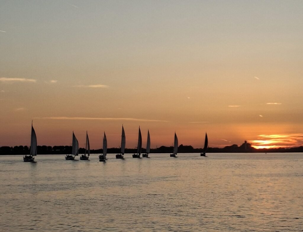Een prachtige baan en zonsondergang zorgden dat de stemming aan boord van de deelnemers fantastisch was. Er waren er die heel gedreven waren en voor de eerste plaats gingen, een enkele nam de binnenbocht en won seconden op een andere deelnemer. Er waren ook deelnemers die het gezellig hadden, wat keuvelden met elkaar en zo genoot een ieder van deze bijzonder mooie avond. En zoals bij iedere race de één finisht als eerste (wat niets zegt over de rating) en de ander heeft meer tijd nodig. Zo ook de Seacat (kleinste deelnemer v.w.b. afmeting) voer braaf de baan in het donker zonder plotter en deed letterlijk en figuurlijk het licht uit. Er werd gekoerst op de Marlie, het lichtpuntje op de horizon. Zo fijn dat de Marlie als een goed huisvader wachtte tot alle deelnemers over de finish waren. De Marlie zette zijn schijnwerper bij en voer richting de haven van Yerseke met de wedstrijduitslag. De opvarenden van de Marlie vonden het een supermooie race, vooral omdat de deelnemers rondom de boot kwamen zodat zij konden genieten van een grandioze wedstrijd.