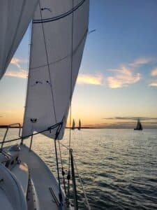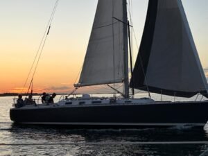 Een prachtige baan en zonsondergang zorgden dat de stemming aan boord van de deelnemers fantastisch was. Er waren er die heel gedreven waren en voor de eerste plaats gingen, een enkele nam de binnenbocht en won seconden op een andere deelnemer. Er waren ook deelnemers die het gezellig hadden, wat keuvelden met elkaar en zo genoot een ieder van deze bijzonder mooie avond. En zoals bij iedere race de één finisht als eerste (wat niets zegt over de rating) en de ander heeft meer tijd nodig. Zo ook de Seacat (kleinste deelnemer v.w.b. afmeting) voer braaf de baan in het donker zonder plotter en deed letterlijk en figuurlijk het licht uit. Er werd gekoerst op de Marlie, het lichtpuntje op de horizon. Zo fijn dat de Marlie als een goed huisvader wachtte tot alle deelnemers over de finish waren. De Marlie zette zijn schijnwerper bij en voer richting de haven van Yerseke met de wedstrijduitslag. De opvarenden van de Marlie vonden het een supermooie race, vooral omdat de deelnemers rondom de boot kwamen zodat zij konden genieten van een grandioze wedstrijd.